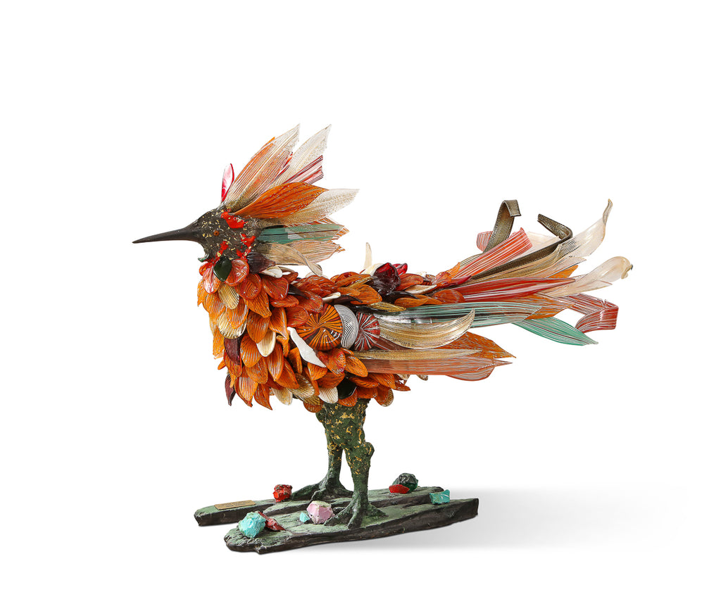 Glass & bronze. Work made with applied feathers in opaque and transparent polychrome glass produced directly by Toni Zuccheri in 2007. The base and skeleton are in lost-wax cast bronze made in 1987 by Fonderia Opere d'Arte O. Brustolin (VR - Italy). The work is enriched with metal powders, sand and glass grit. This example is number 6 of 9 that were produced. Each one varies dramatically in color and spirit.