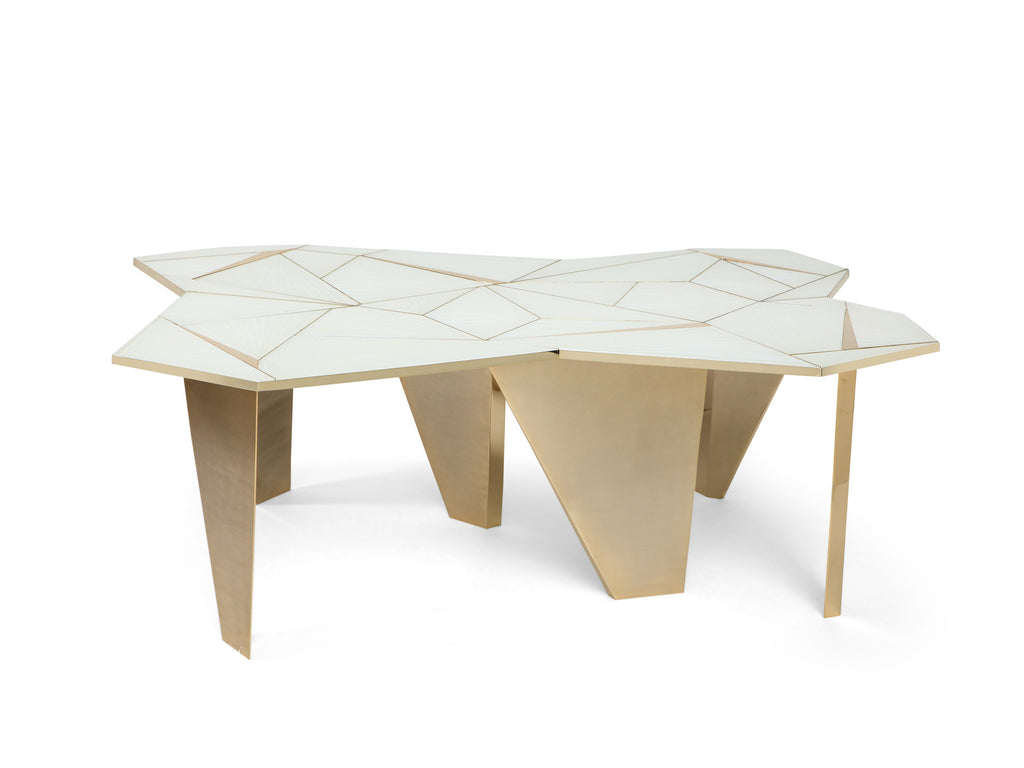 Italy | 2018 Studio-built table of hand-carved glass panels with a unique iridescent finish. Irregular brass legs that come up through the top, creating abstract triangular surface details. Limited edition of 12, plus 2 artist proofs.