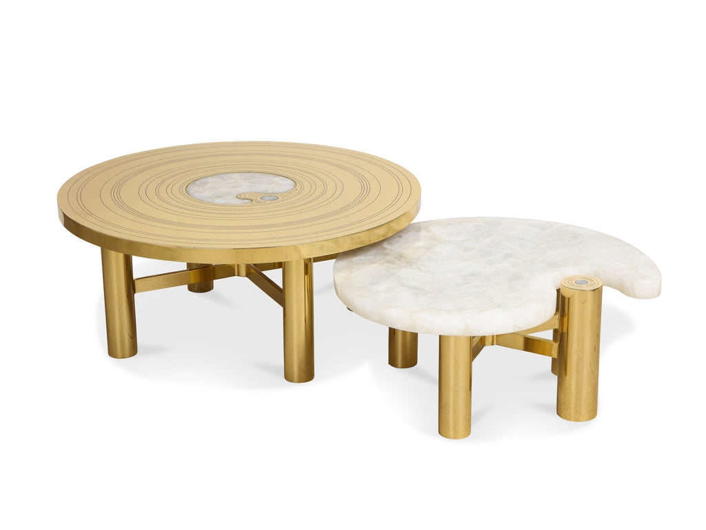 Polished brass, quartz. 2pc nest with larger table featuring incised brass top and inset quartz center. Lower table with slab quartz top. 15-20 weeks lead time.