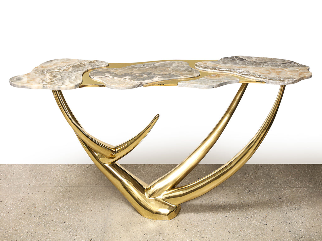 France | 2022 Cast brass, onyx. Amorphous onyx regions floating on brass with a cast horn-shaped base. Made per order in France. Lead time 6 - 8 months.