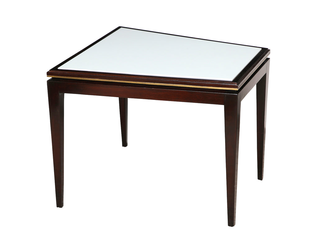 USA | c. 1955 Wedge shaped table of dark stained wood, with brass trim and white carrera glass insert top. Elegant form with nice detailing.
