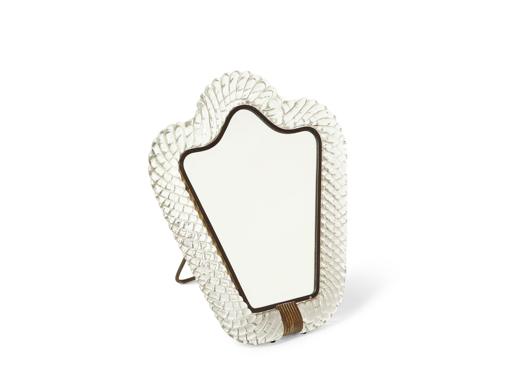 Italy | c. 1938 Carved glass, mirror, brass, wood. Torchon-glass frame, and mirror center with brass surround. Movable brass stand on rear.