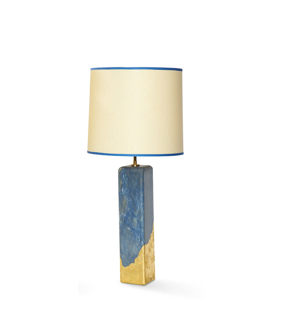 France | 2016 Solid stone lamp of Azul Macaubus with rounded corners and gold leaf around the lower portion. The lamp has 2 standard sockets that swivel. Made per order in France with a 20-24 week lead time.