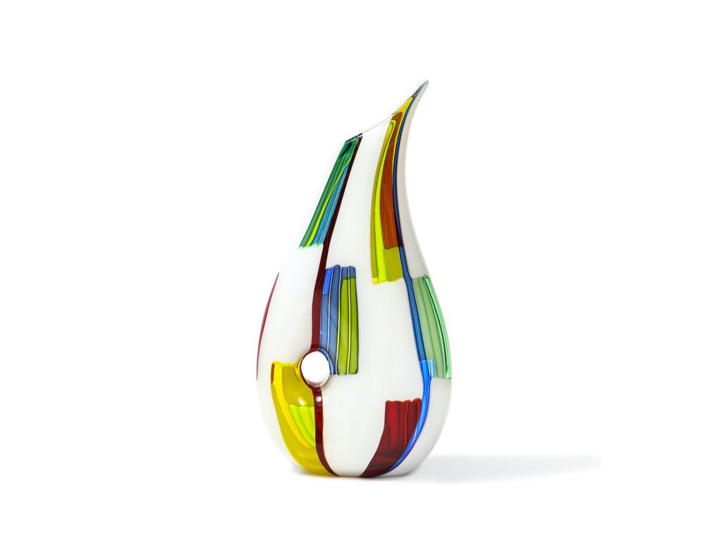 Italy | c. 1956 Handblown, Murano white glass decorated with rods of colored glass & swaths of opaque white glass. Abstract pitcher form.
