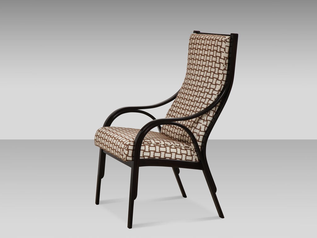 Italy | c. 1959 Tall-back armchair of layered bent-wood and upholstered seat and back. Produced by Sim and awarded an honorable mention in 1960s Compasso d’Oro.