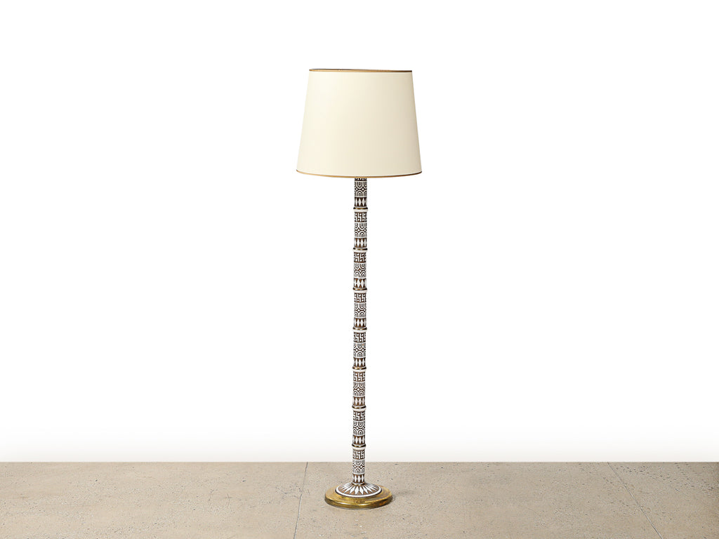 Italy | c. 1968 Ceramic, brass, painted aluminum, paper shade. A fantastically patterned floor lamp with 3 x E26 Sockets. 2nd matching lamp available.