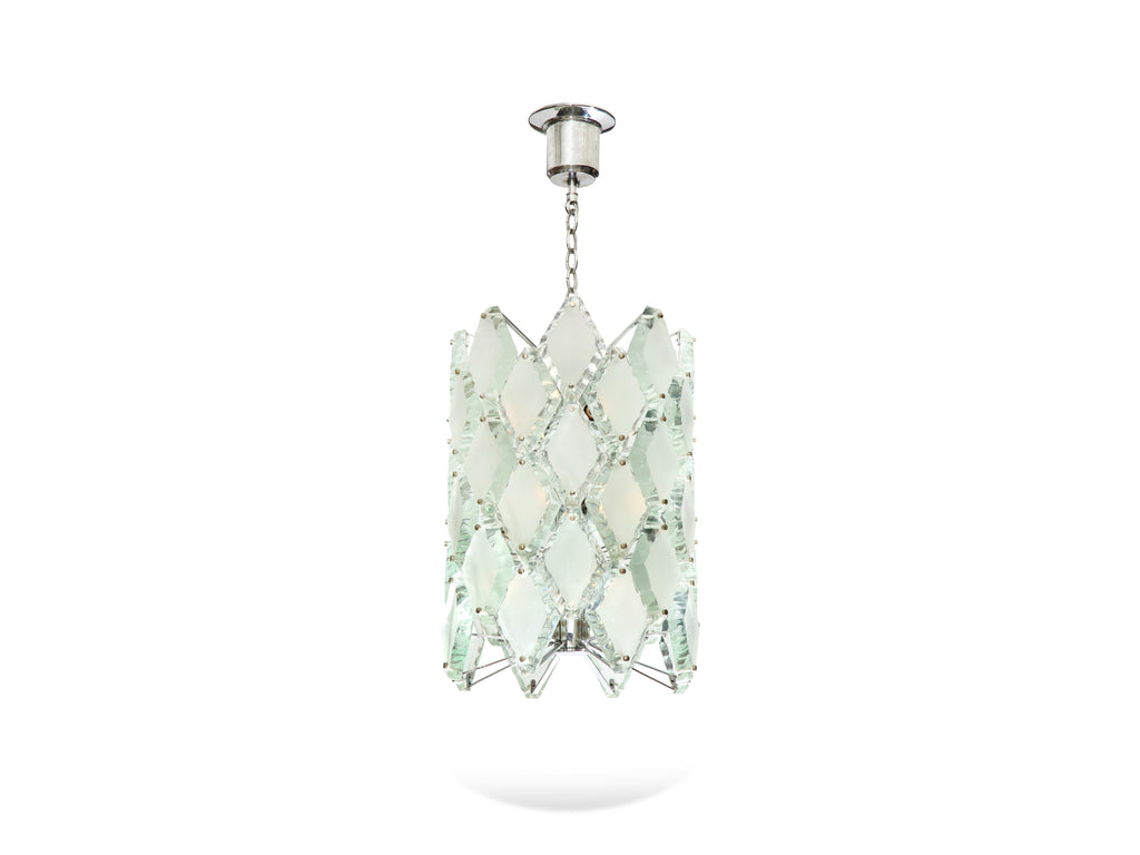 Italy | c. 1955 Chromed metal structure supporting 48 slabs of cut-glass diamond forms, Each with frosted fronts and chiseled edges. 12 candelabra sockets.