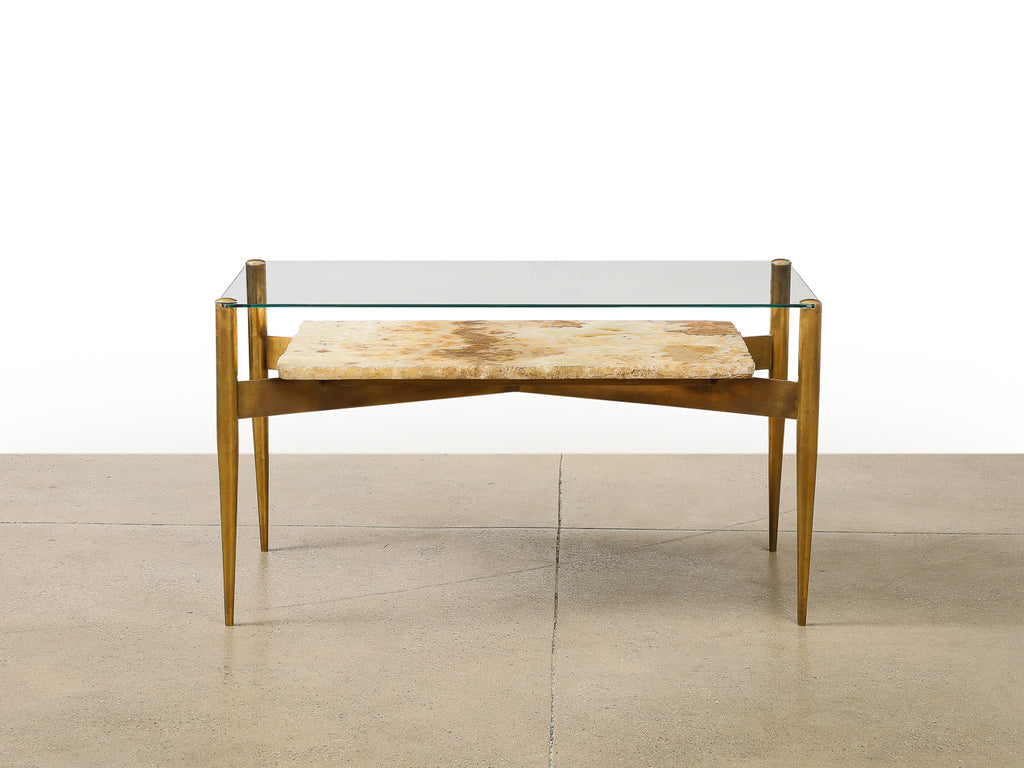 Italy | c. 1950 Tempered glass, brass, Egyptian alabaster. Executed by Giordano Chiesa, Milan. Very few examples of this model were ever made. Each varied in size and stone specimen, making each table unique.