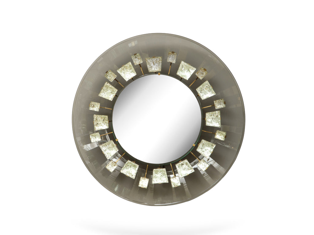 Italy | 1966 Model # 2044, featuring 24 chipped crystal chunks attached to articulating brass arms. Curved back-plate of smoked gray colored glass and center mirror concealing 3 candelabra sockets. This model dates to 1966 as indicated by the stamp on the back of the mirror. A significant Ingrand design.