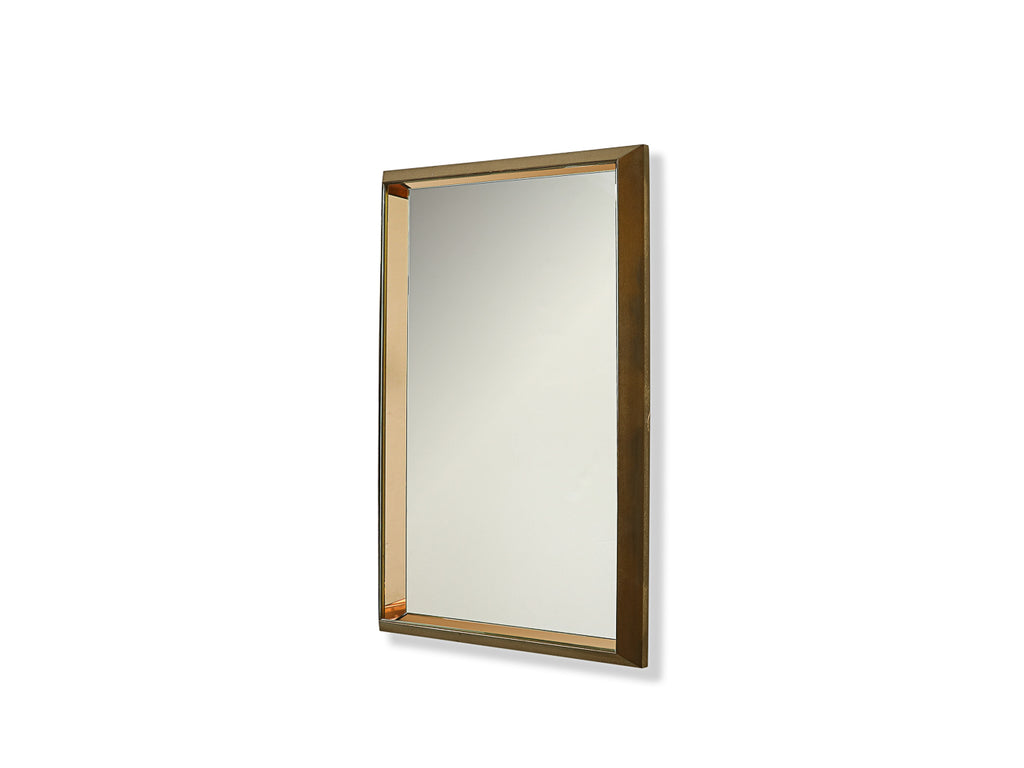 Brass, colored glass, mirrored glass. Vertical mirror with exterior brass frame and interior frame of beveled rose colored glass panels.