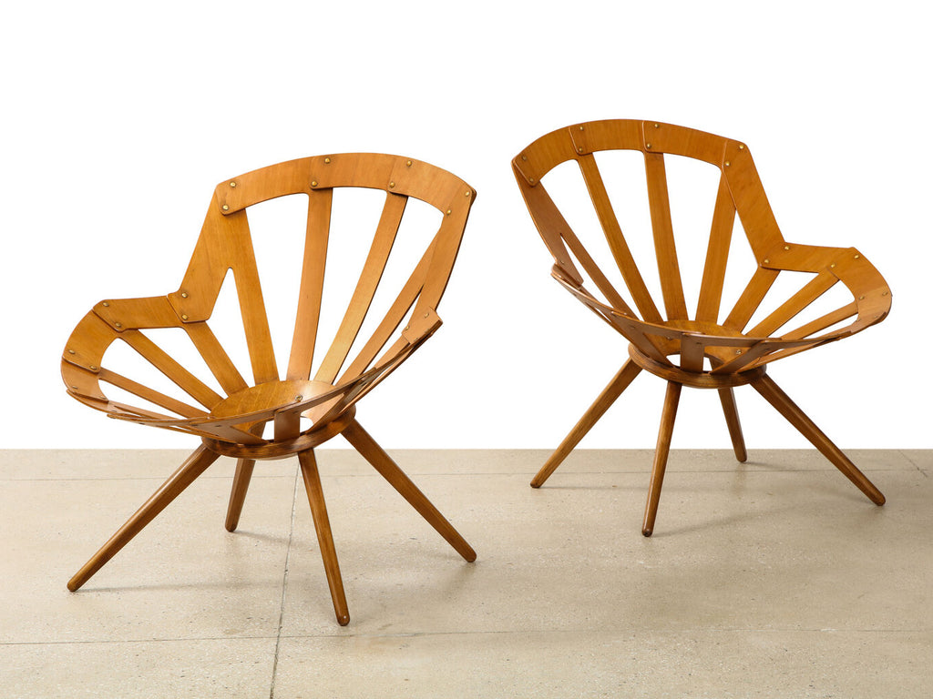 Italy | c. 1954 Birch plywood, birch, fabric, brass. This model was exhibited at the X Triennale di Milano, 1954. Iconic & complex chairs made of the simplest of materials.