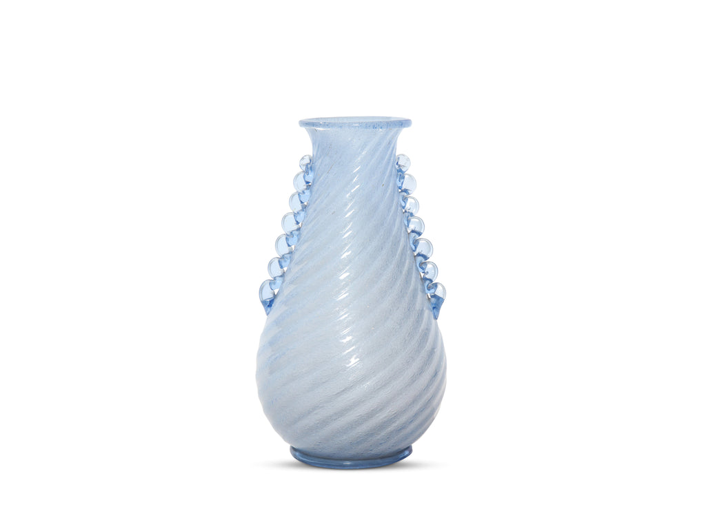 Model #884, produced by Aureliano Toso, on the island of Murano. Beautiful vase in pale periwinkle glass with swirled ribbing and applied side decorations and foot.