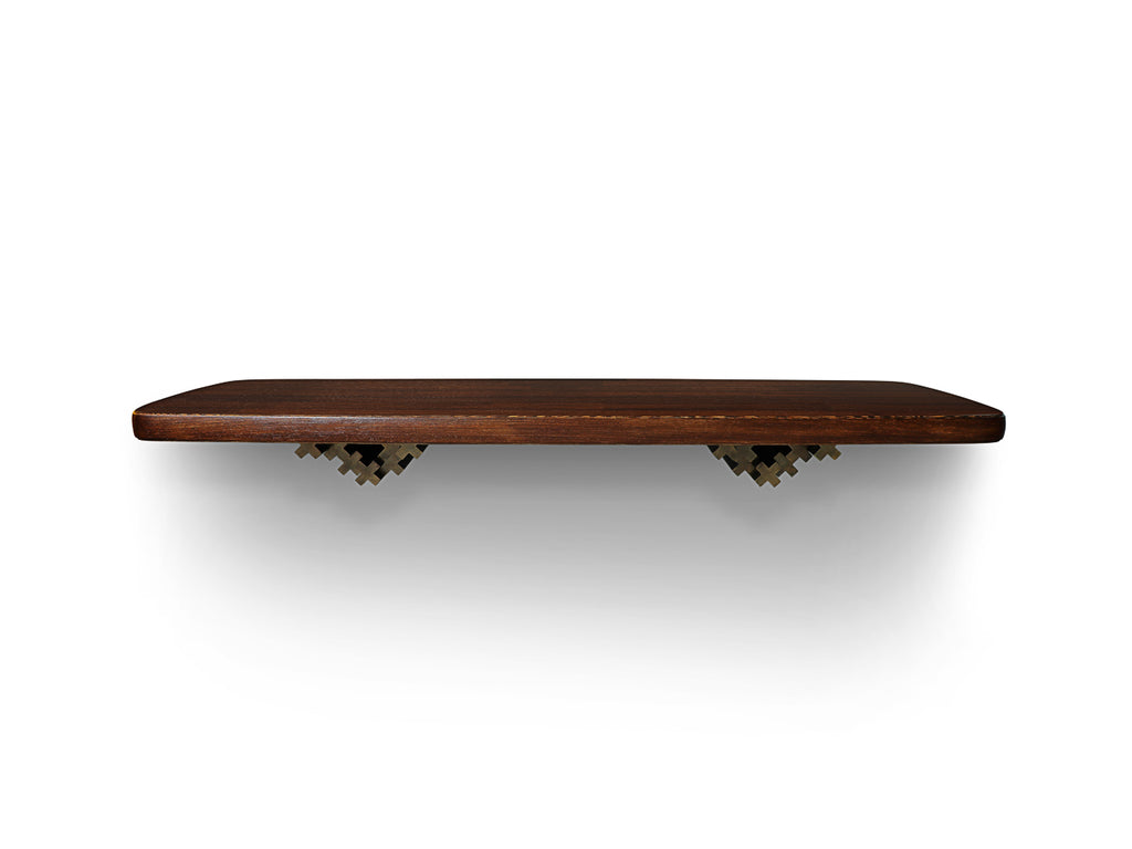 Italy | 1971 Panga Panga (similar to Wenge) wood, brass. Wall-mounted console with bowed sides. Table top rests on 2 sculptural, x-form brass supports. One from a pair of unique consoles created for a Palm Beach residence.