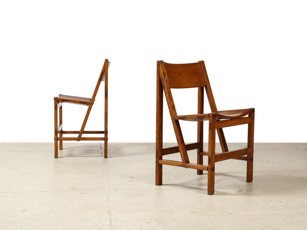 Italy | c. 1970's Stained oak. Total of 8 chairs available. Designed in 1962 but not realized until 1968. These chairs are handmade with great joint details. Price shown is per pair.