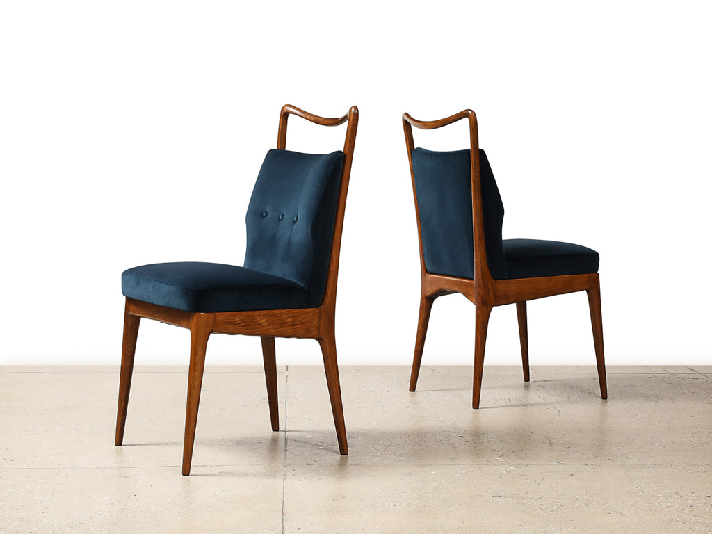 Italy | c. 1950s Italian walnut, fabric. 2 sets of 4, sold by the pair. Currently we have a total of 8. Each group of 4 varies slightly from the other. *Only 2 chairs from one set have been restored so far. Several chairs retain ISA labels. Priced as pairs.