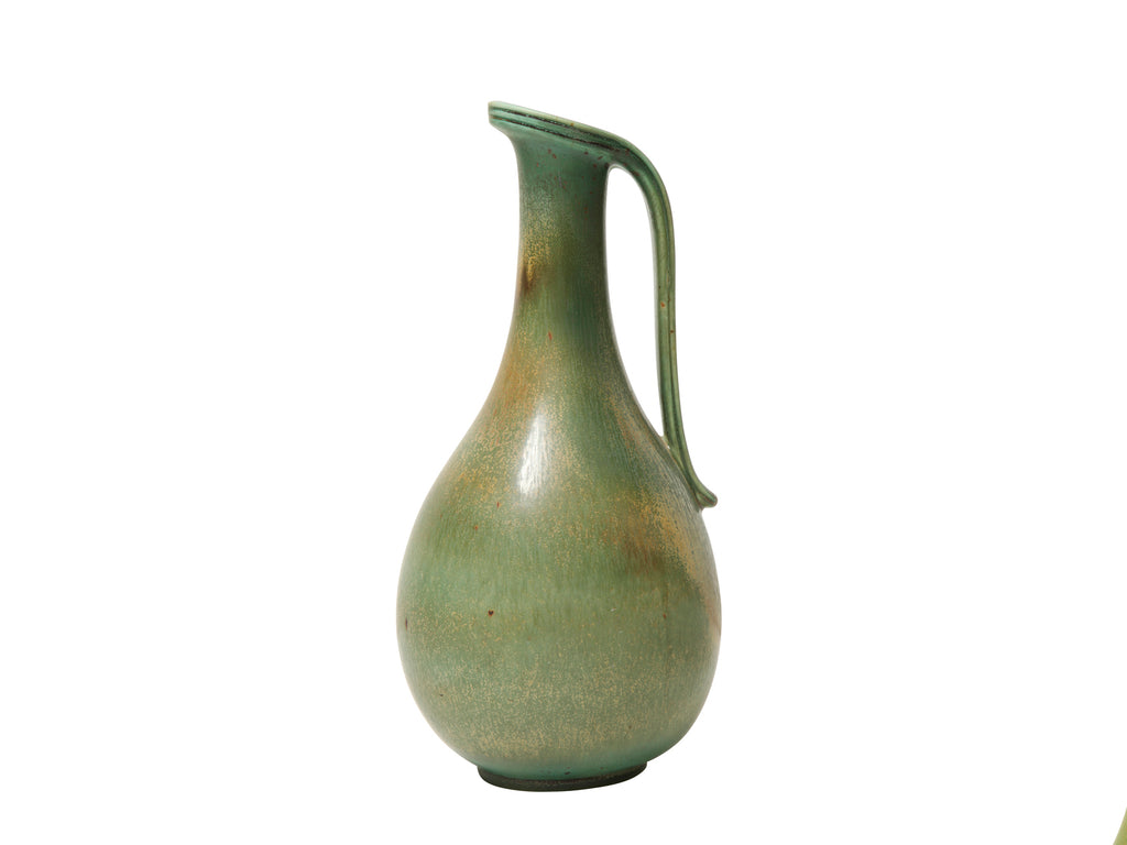 Sweden | c. 1945 Handmade stoneware pitcher with pale green feather glaze.