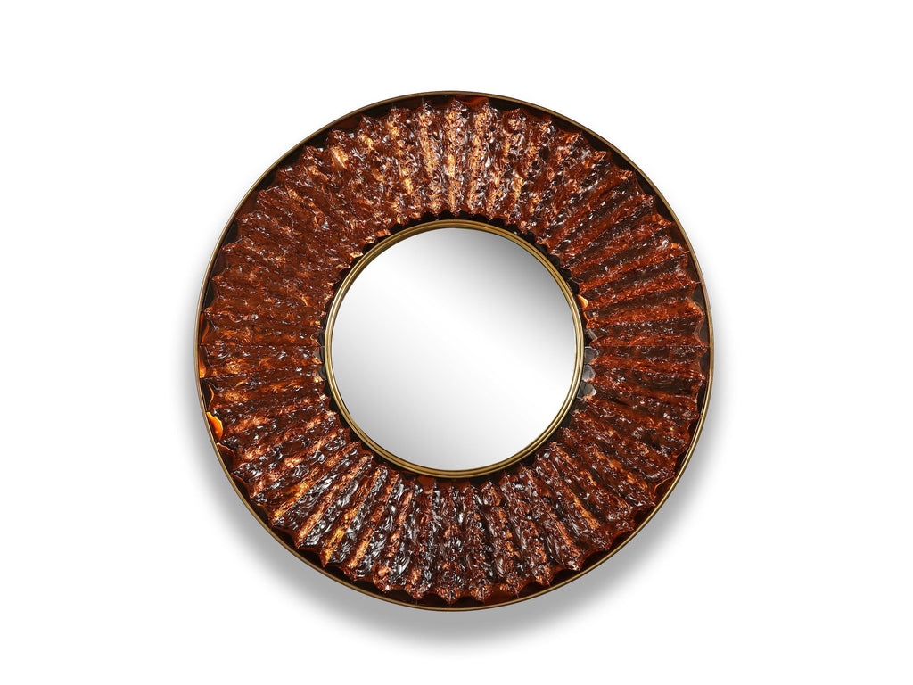 Hand-cut & chiseled slabs of burnt orange colored crystal surround a central, circular convex mirror. Oxidized brass surround and mount. Signed on outer edge.