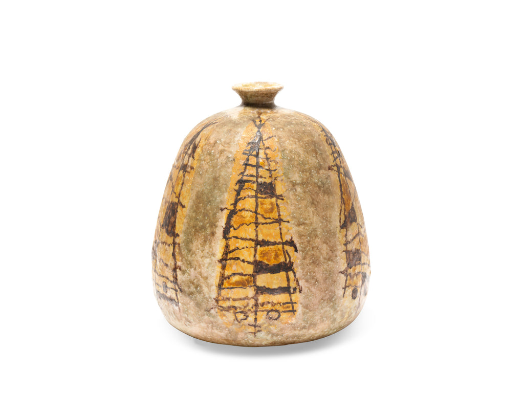 Italy | c. 1955 Earthenware vase form with pinched neck. Rough surface texture with abstract, primitive decoration and glazes of light and dark brown and yellow.