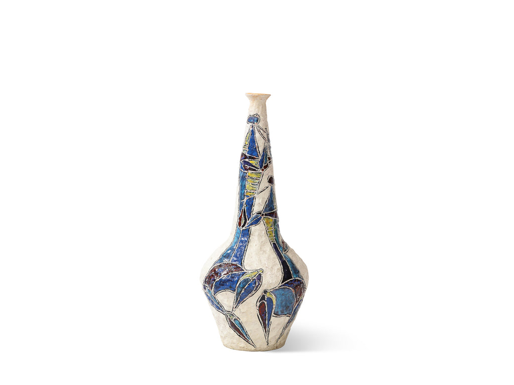 Italy | c. 1956 Hand-built earthenware bottle with rough, matte white glaze, and multicolored cubist figure on front.