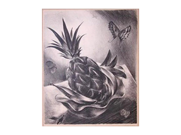 Surrealist pineapple lithograph with butterflies. Matted and framed.