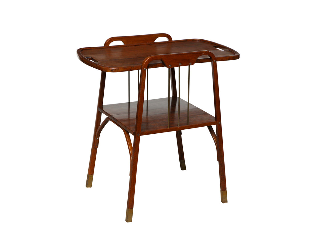 Austria | c. 1910 Stained beechwood table w/ lower shelf, brass mounts & sabots. Signed underneath w/ Thonet label.