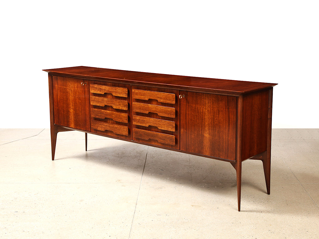 Italy | c. 1948 Rosewood veneer, walnut, brass. 4-door cabinet with faux drawer fronts, and 2 main compartments with one shelf in each. Comes with 2 brass keys.