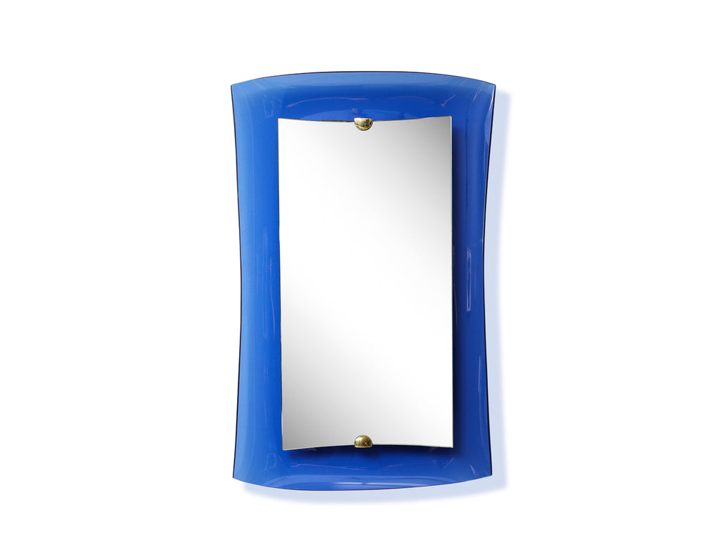 Italy | c. 1962 Glass, mirror, brass. Model #2712. Concave blue glass frame with a raised mirror held by brass hardware.