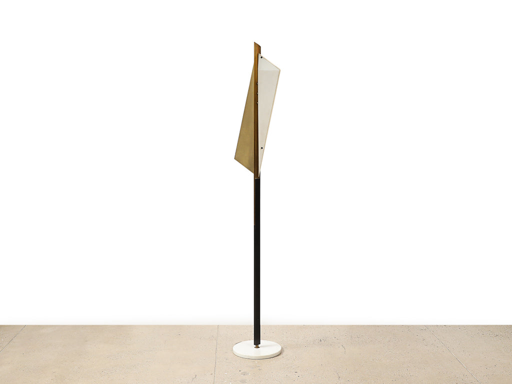 Italy | c. 1958 Painted metal, brass, marble, frosted glass. 2 x E26 sockets. Arredoluce stamp to the underside of the foot switch.
