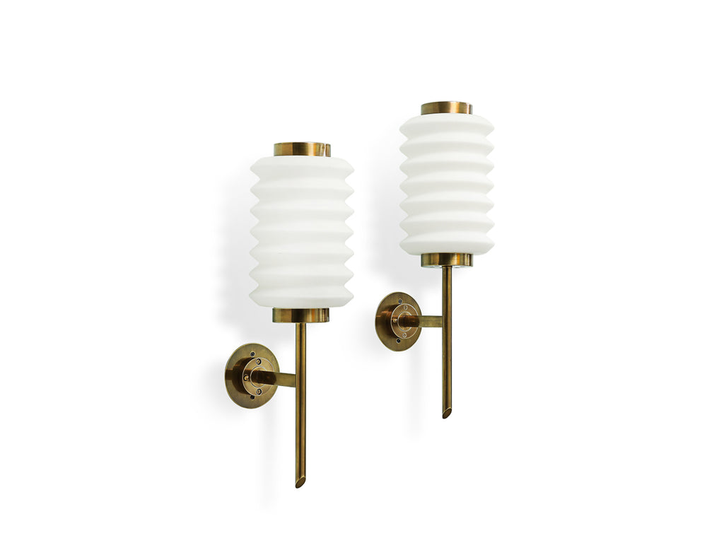 Italy | c. 1959 Brass, frosted glass. Lantern-style lights, each with one acid-etched glass shade with pleated design. One standard E26 socket per light.