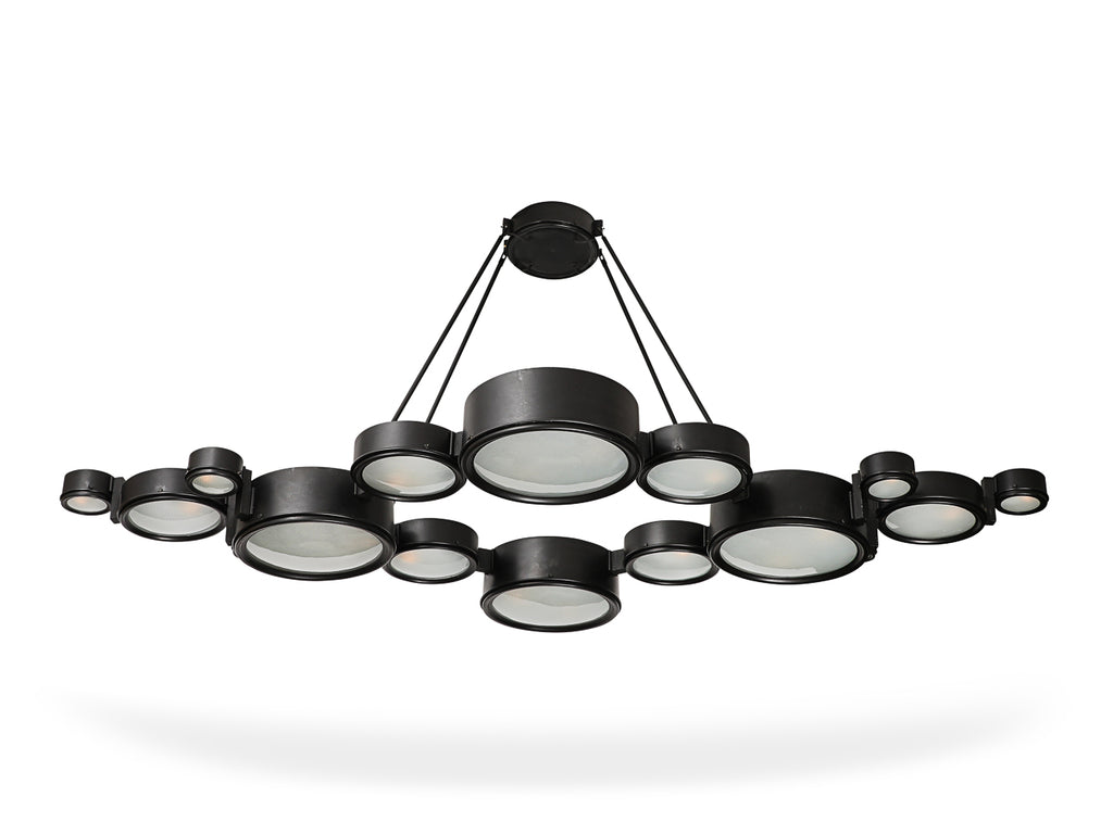 Black lacquered brass, black lacquered aluminum, frosted & textured glass. A large, custom example of this highly prized model by BBPR. Arteluce sticker inside one cylinder. *It is believed that this fixture is one from a unique pair that were custom ordered for a commercial application. This fixture takes 6 x E12, (candelabra) bulbs and 24 x E26 bulbs.