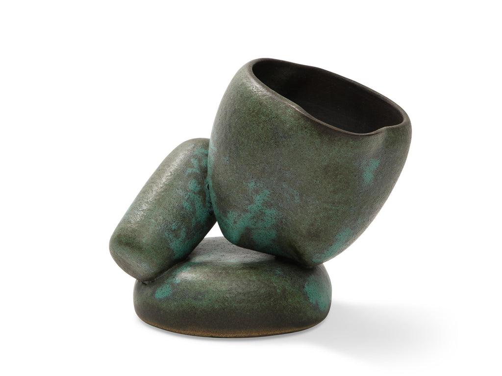 Asymmetrical assemblage of wheel-thrown elements. One large bowl, tipped and resting on two closed forms. Green glazes with bubbly texture and irregular surfaces. Artist-signed on underside.