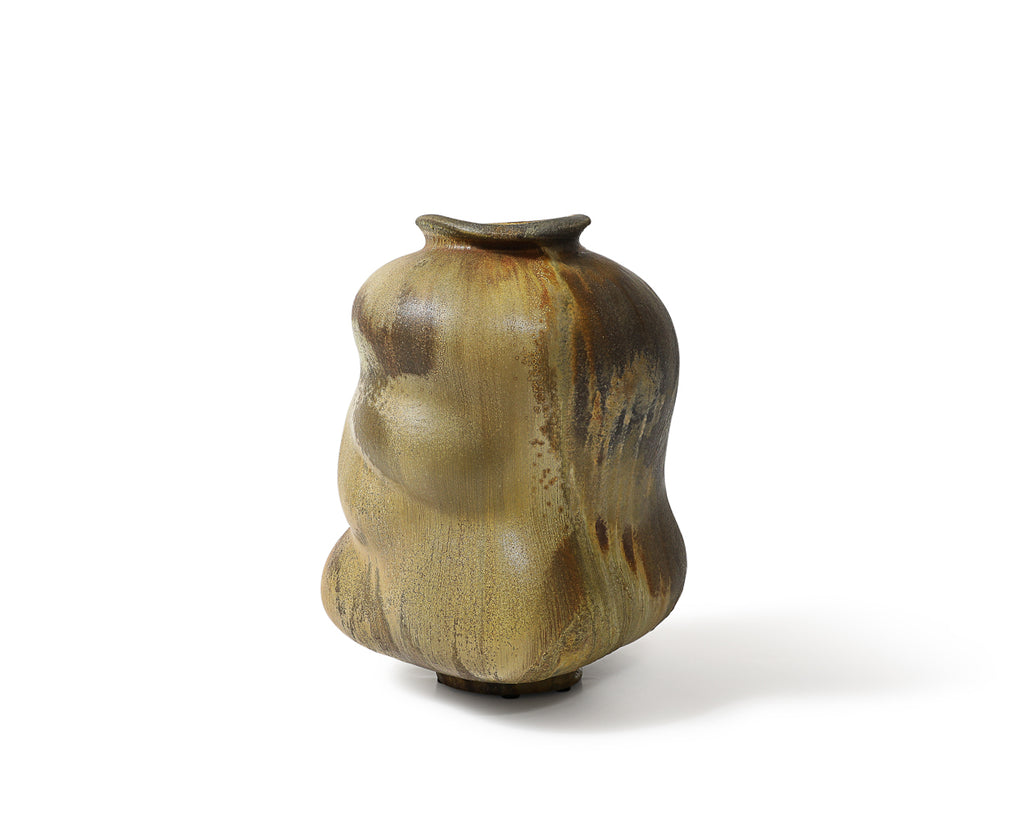 Glazed stoneware. Anagama wood-fired vase of amorphic form. Artist-signed on underside.