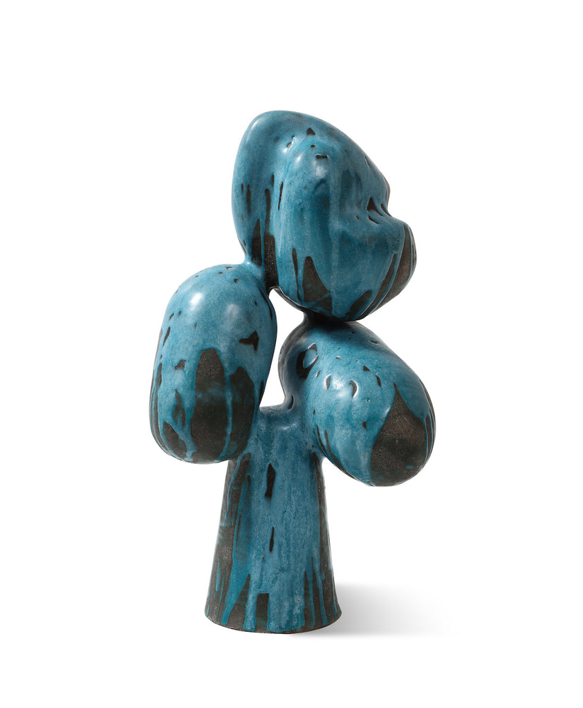 Glazed ceramic. Assemblage sculpture with 3 organic forms balancing atop a conical base. Black clay dripping with turquoise colored glaze. Artist-signed on underside.