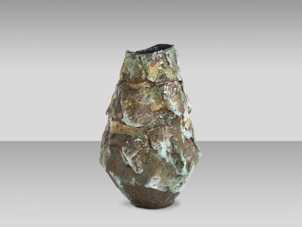 Hand-built, glazed stoneware vase form.