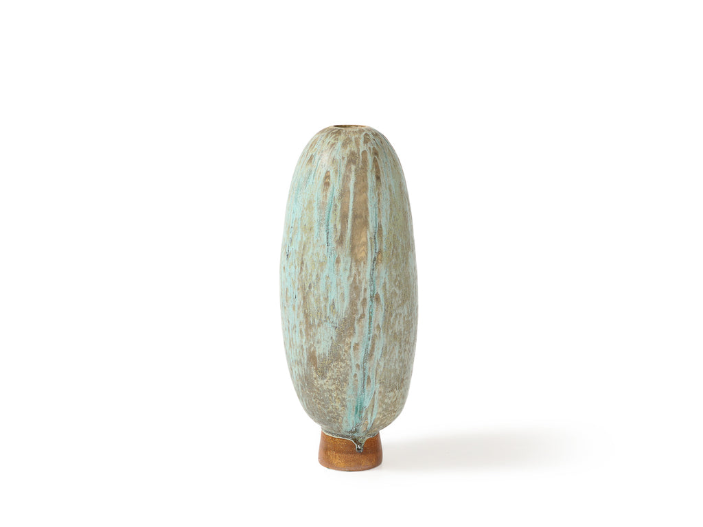 USA | 2023 Glazed stoneware. Blue and brown glazes on elongated vase form. Artist-signed on underside
