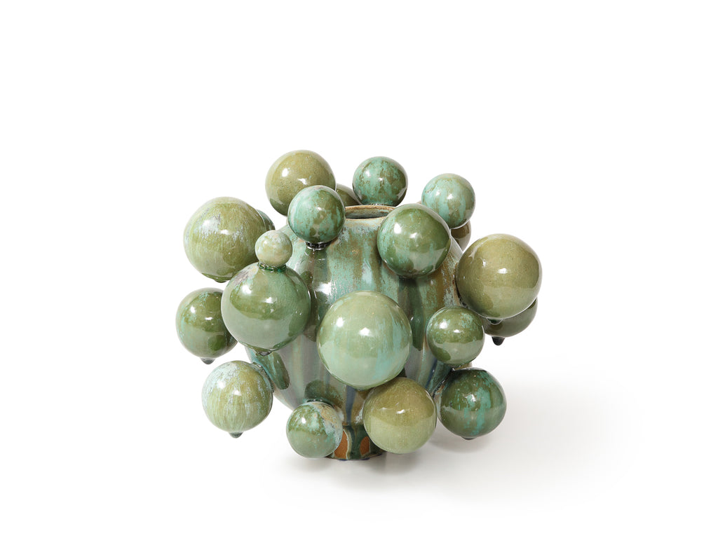 Glazed stoneware. Green glazes, and great relief decoration. Artist-signed on underside