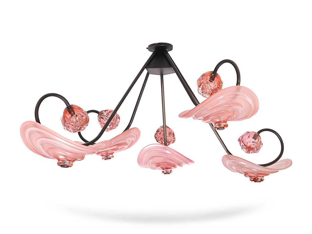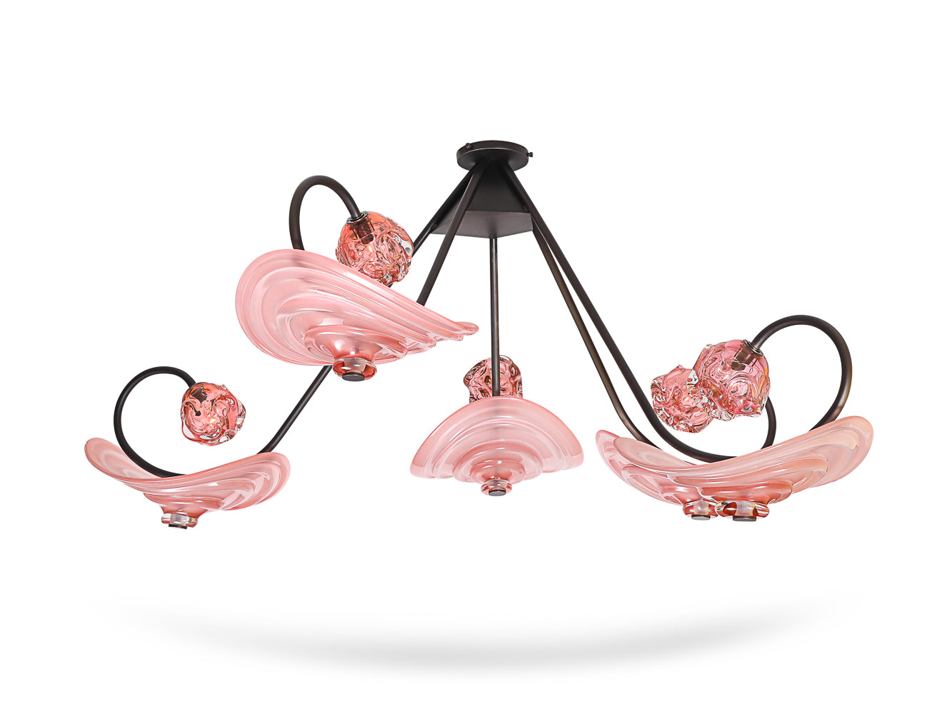 USA | 2025 Blown glass, oxidized brass. Pink, hot-sculpted blown glass elements which include clear morel shades and rippled reflectors. 5 x E12 [candelabra] sockets - recommended bulbs are T-3 KX-2000 incandescent. Made here in New York City and comes UL certified. Custom variations are available; please inquire.