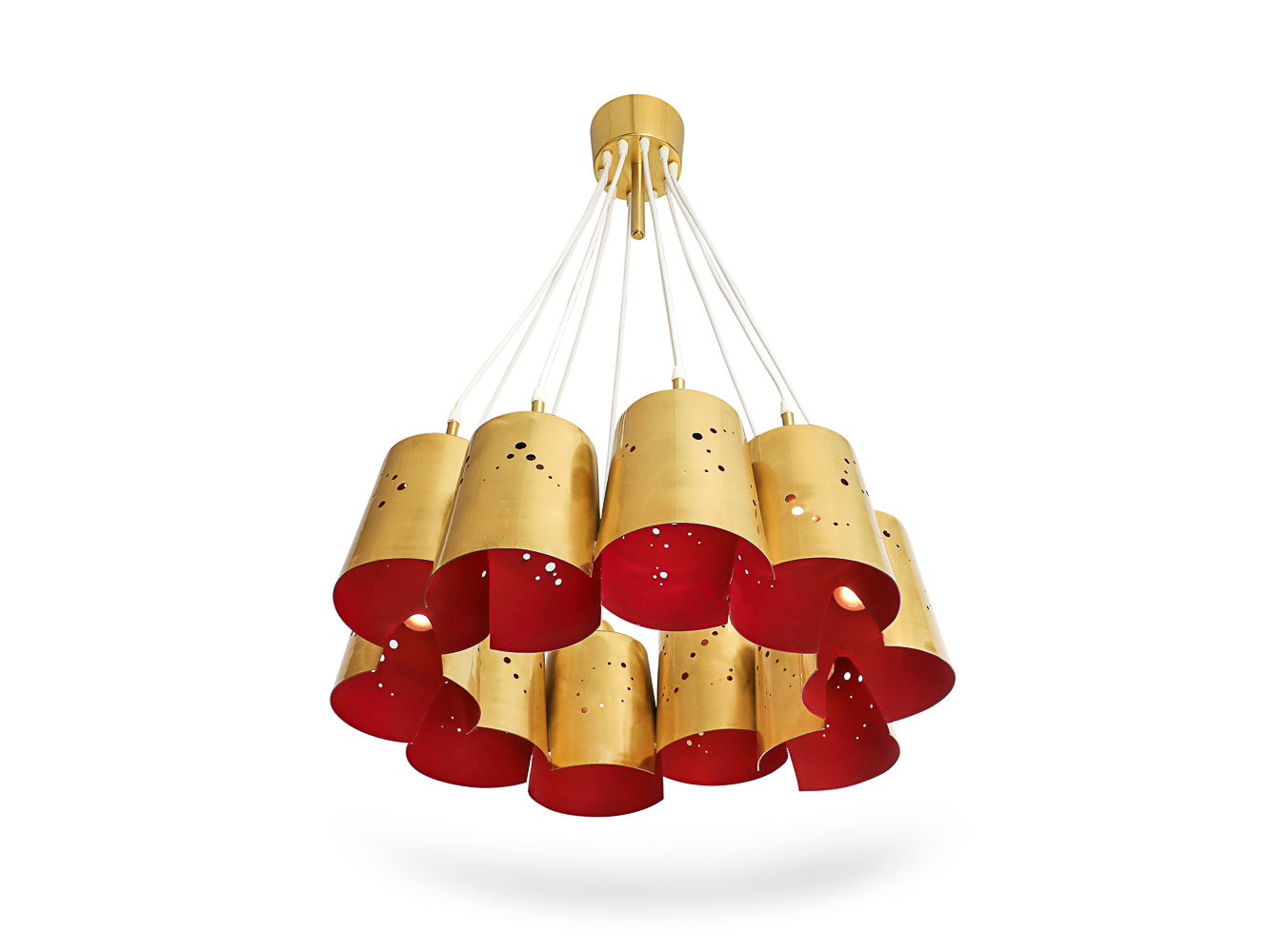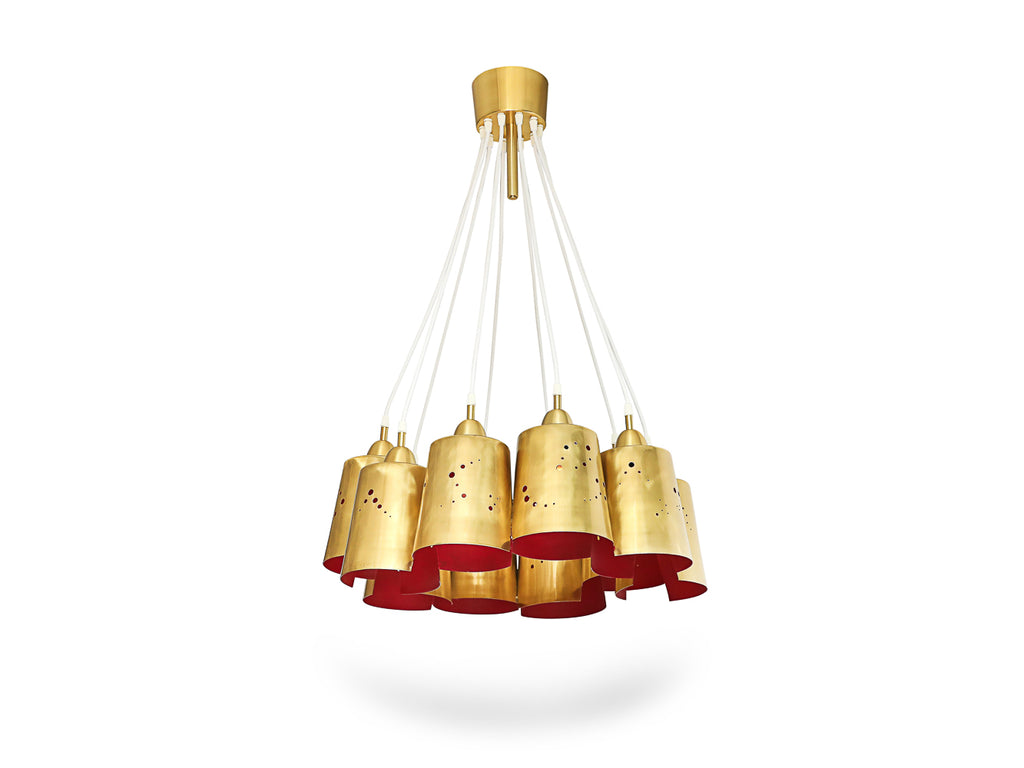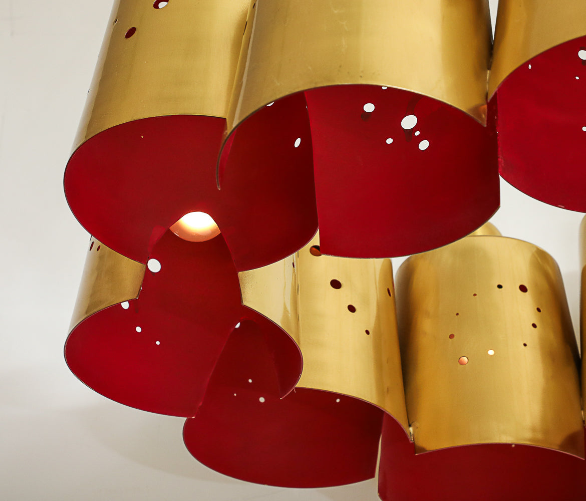Italy | 2024 Polished & lacquered brass, fabric covered cord. 10-light chandelier. Perforated brass shades with lacquered red interiors. Takes 10 x E26 bulbs. UL listed.