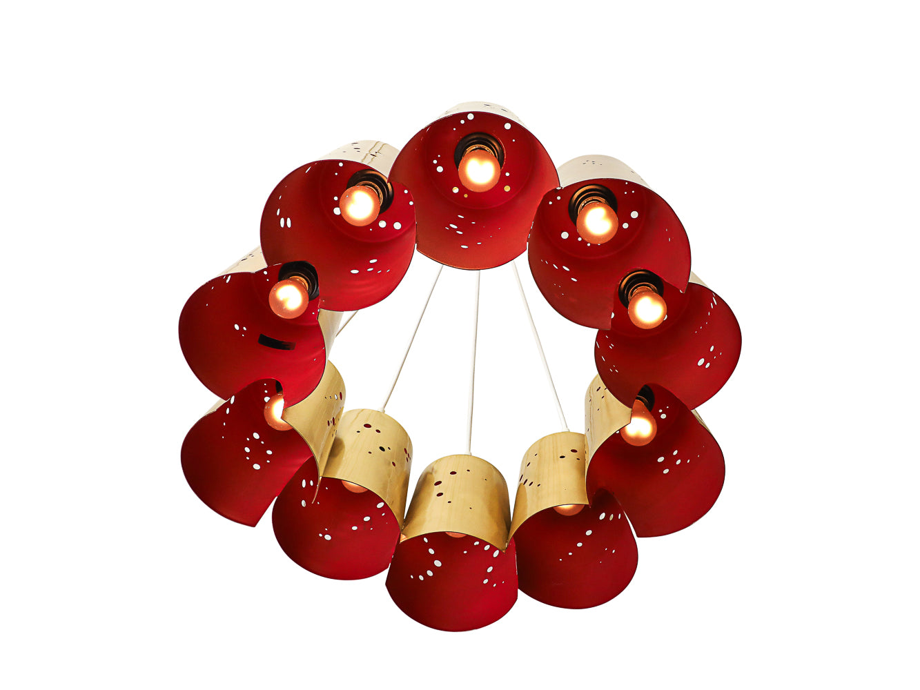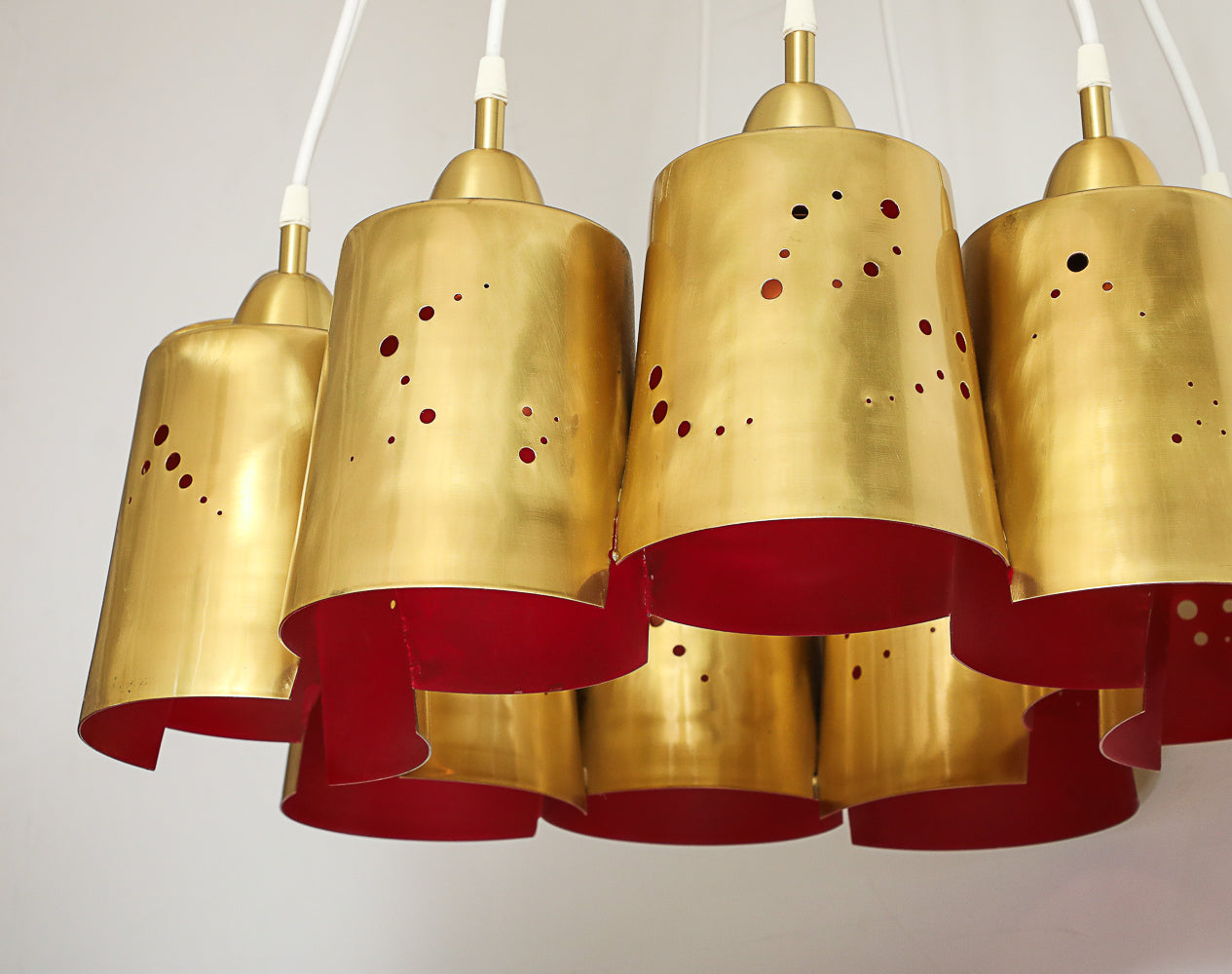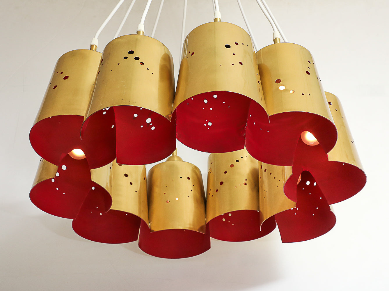 Italy | 2024 Polished & lacquered brass, fabric covered cord. 10-light chandelier. Perforated brass shades with lacquered red interiors. Takes 10 x E26 bulbs. UL listed.