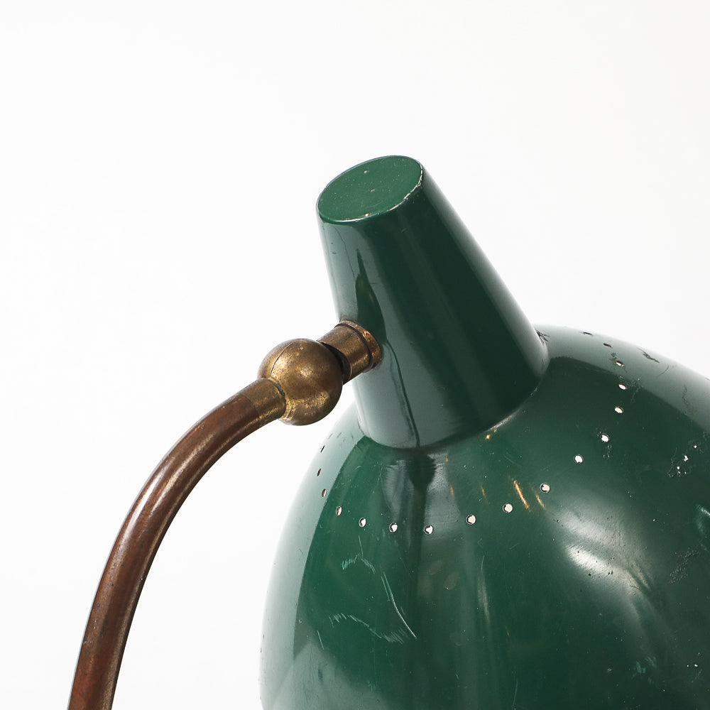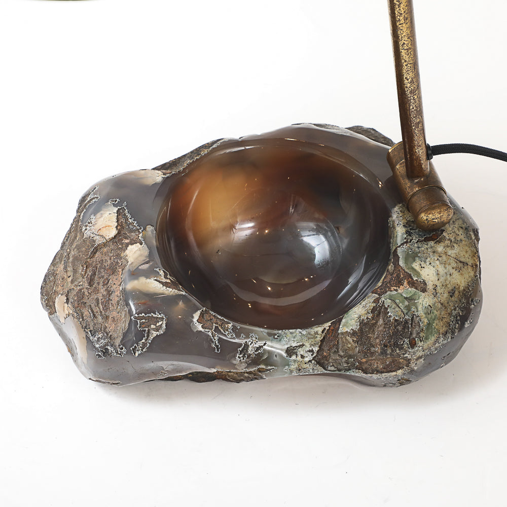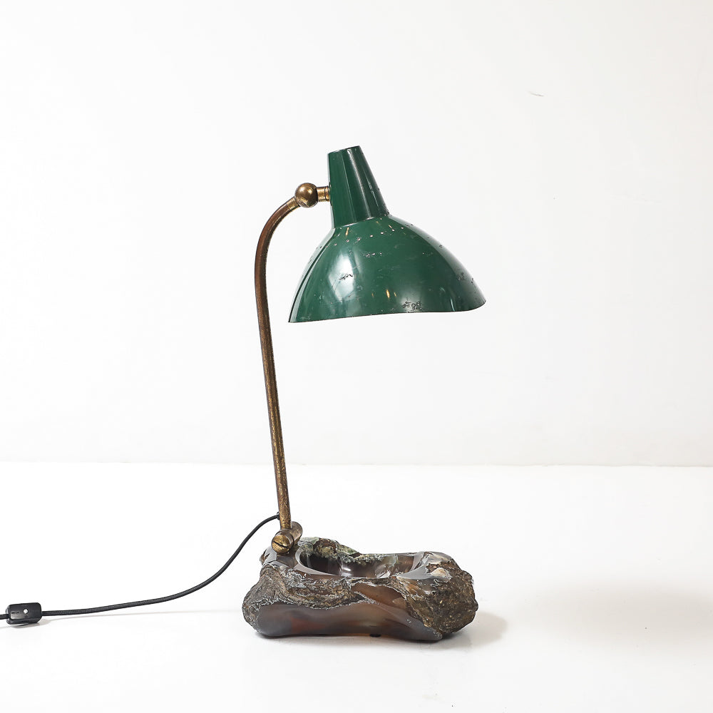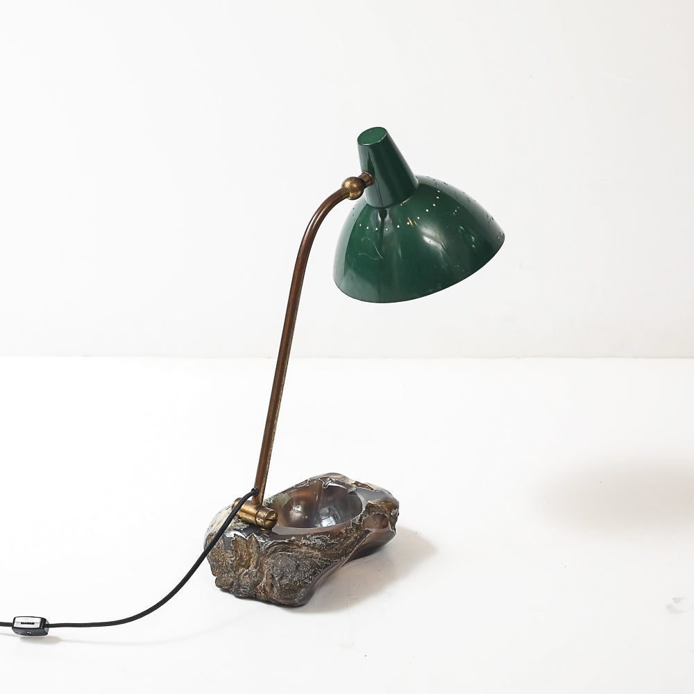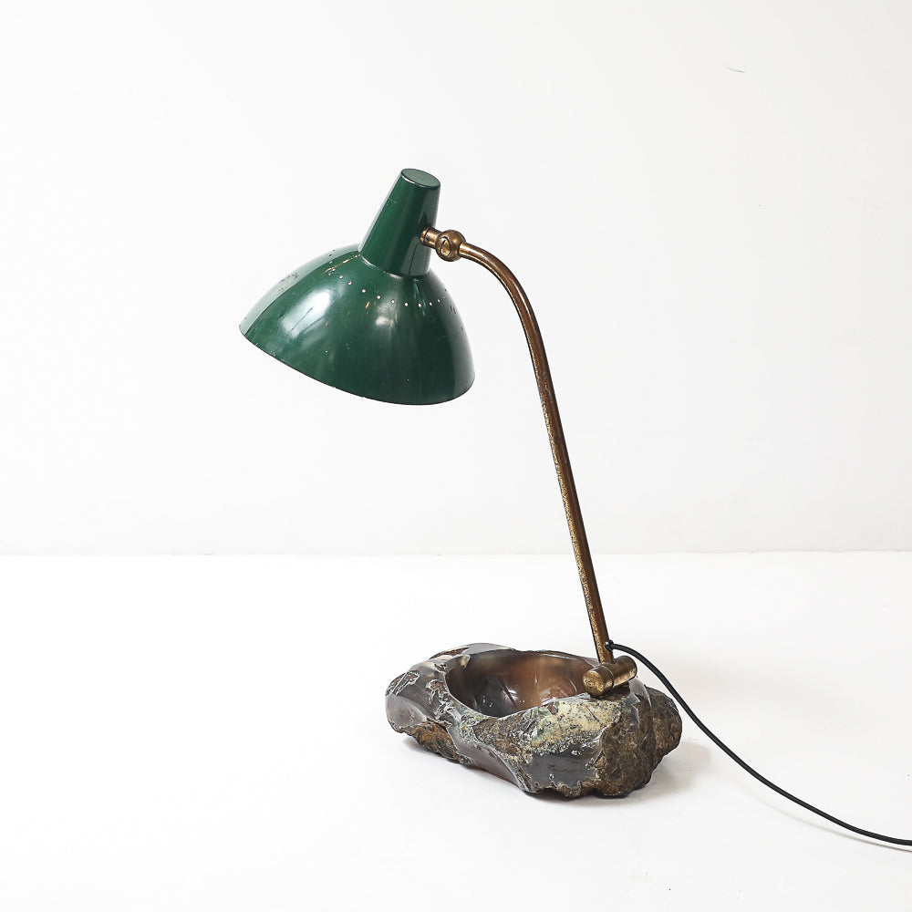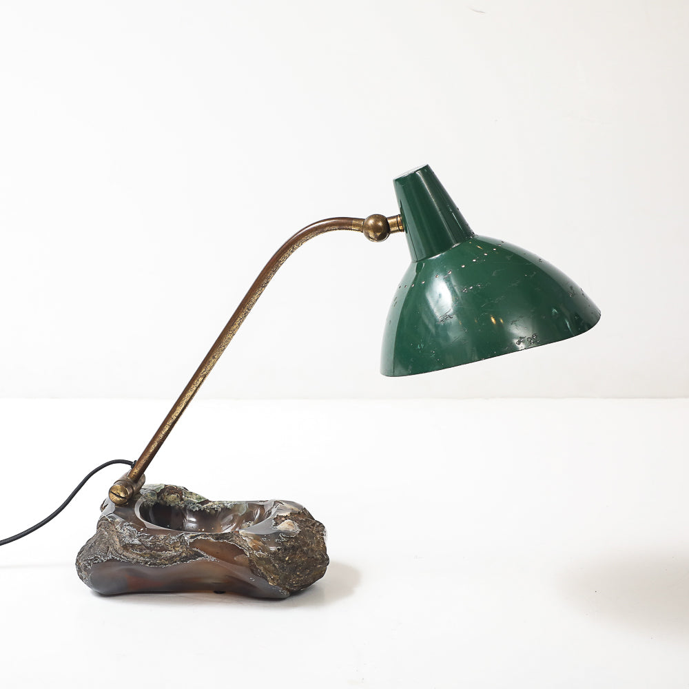 Painted aluminum, brass, stone. Fantastic table lamp of re-purposed vintage materials combined to create a one-off desk lamp with a catch-all dish. Adjustable shade and arm. Takes 1 standard E26 bulb.