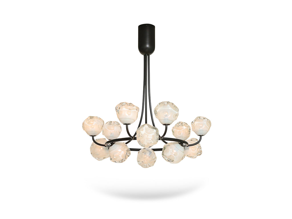 USA | 2025 Blown glass, patinated brass. Brass structure with dark bronze patina and 12 x white, hot-sculpted blown-glass diffusers. 12 x E12 [candelabra] sockets. This fixture can be customized; please inquire. Made in New York City. Lead-time 20-24 weeks. UL listed.
