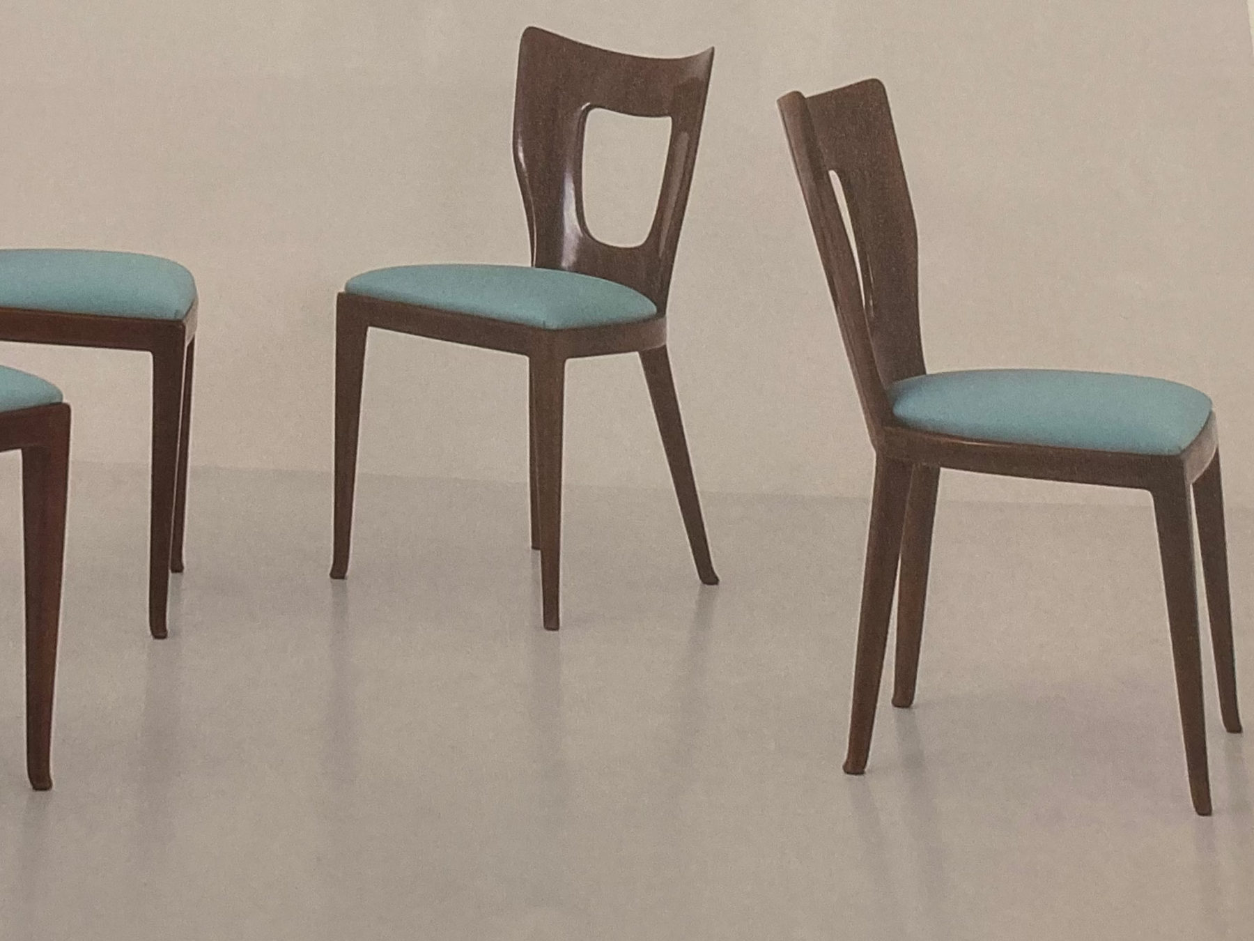Italy | c. 1951 Mahogany, fabric. Sculptural dining/ side chair of solid mahogany with upholstered seat. This model was first presented at the 1951 Triennale exhibition in Milan. These chairs are being offered as a complete set of four.