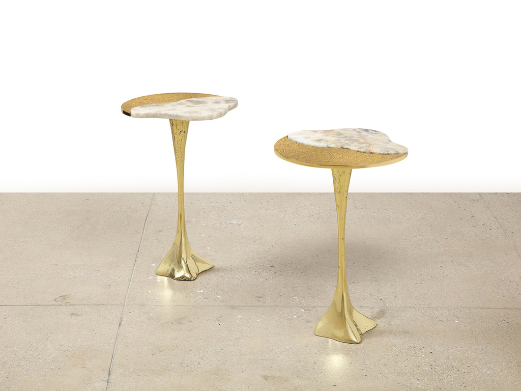Cast & etched brass, onyx. Polished, cast brass free-from base with acid etched brass top and amorphic onyx slabs. Priced as individual tables.