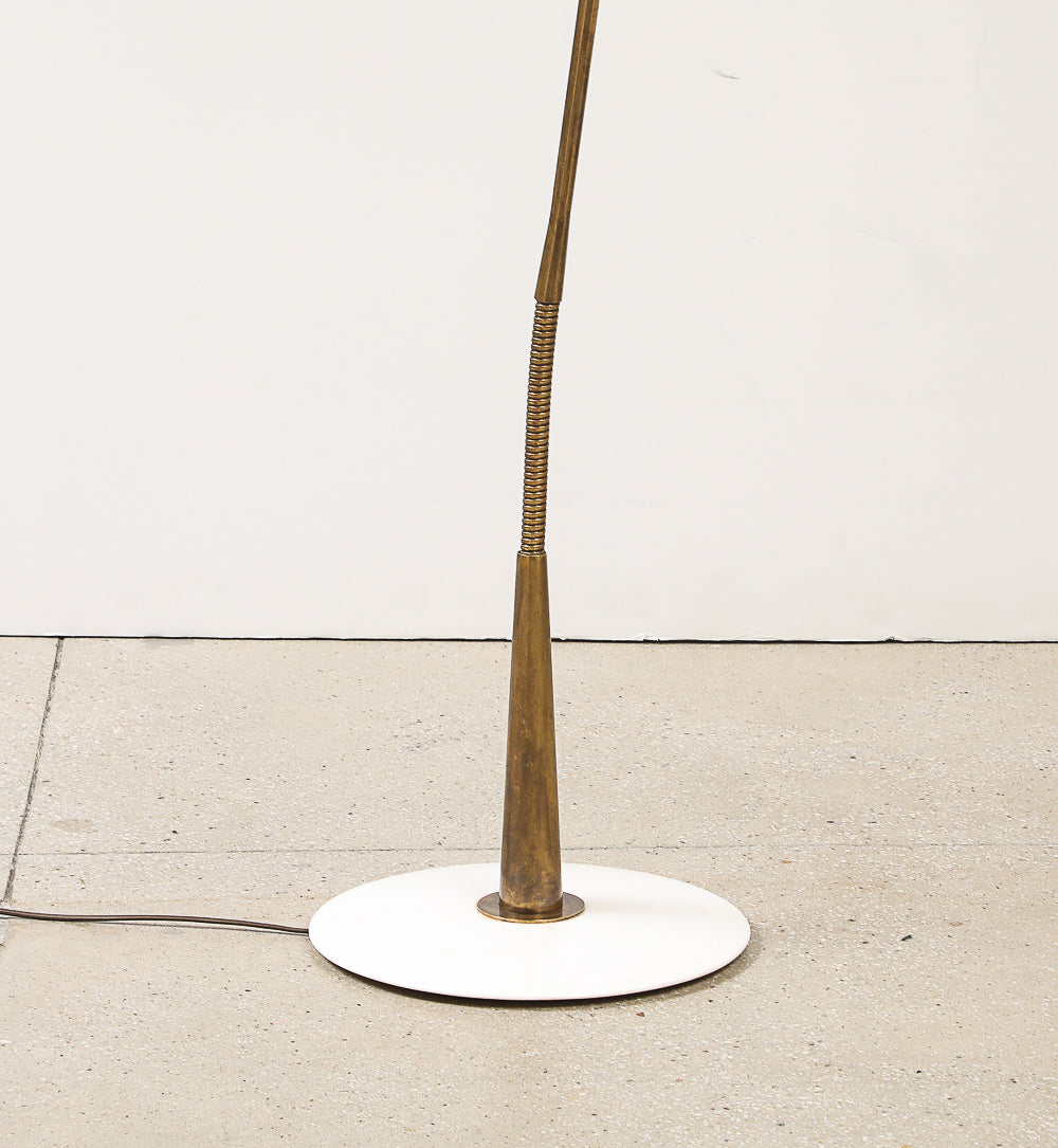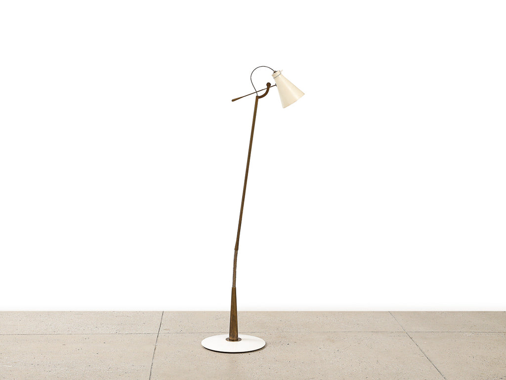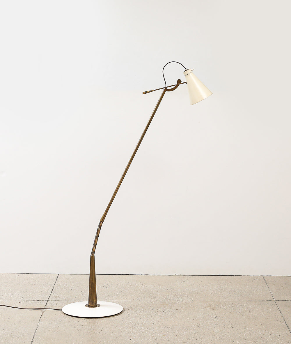 Italy | c. 1948 Lacquered aluminum, brass, and marble. Rare floor lamp featuring a lacquered adjustable shade and flexible brass rod. Polished stone base. Takes 1 x E26 socket. Unsigned.