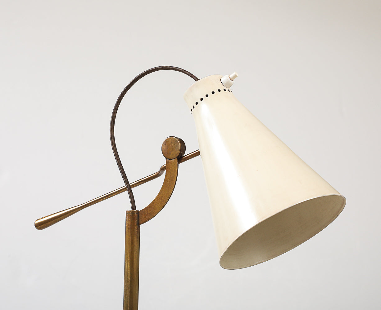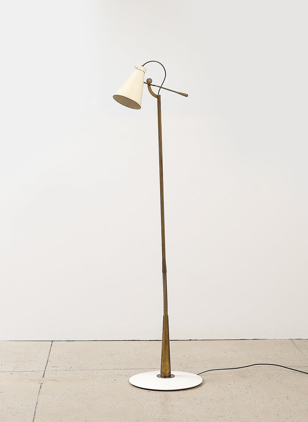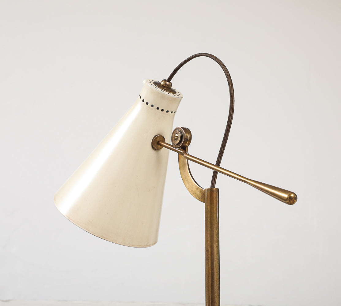Italy | c. 1948 Lacquered aluminum, brass, and marble. Rare floor lamp featuring a lacquered adjustable shade and flexible brass rod. Polished stone base. Takes 1 x E26 socket. Unsigned.