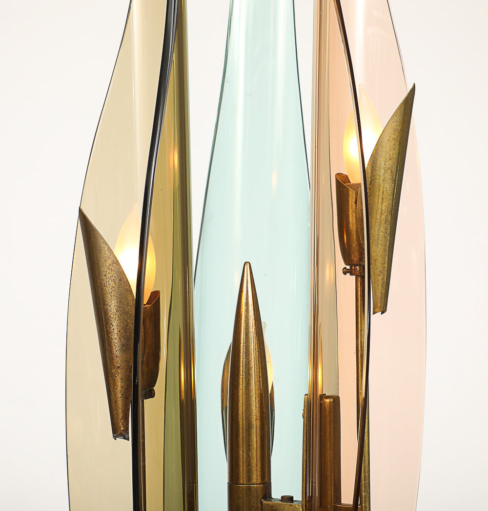 Italy | c. 1958 Colored glass, brass, painted metal. 3 candelabra sockets set into brass mounts and each backed by a beautifully shaped & colored piece of glass. Priced as a pair.