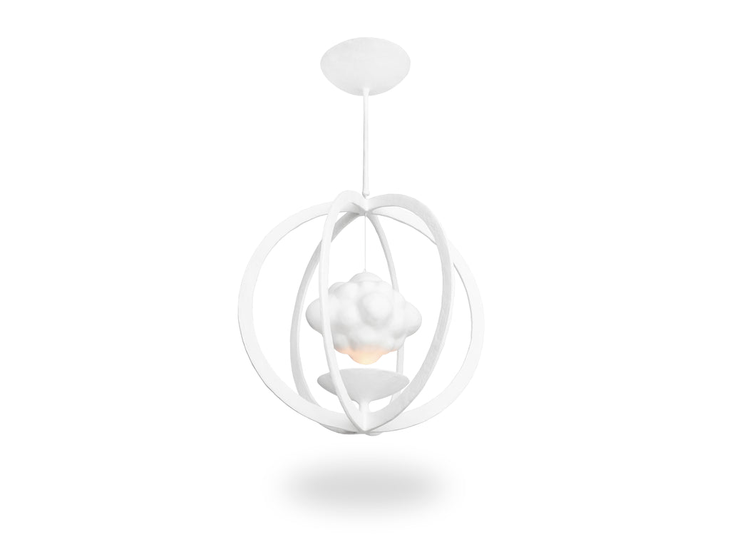France | 2012 Surrealist-inspired pendant of plaster over wood. Gyroscopic form surrounds a shallow dish that illuminates a floating cloud. Available exclusively through Donzella. 20 - 24 week lead time required.