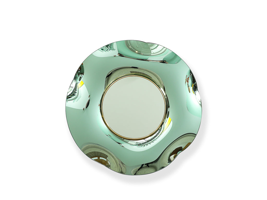 Italy | 2018 Circular wall mirror with incredible frame of undulating mirrored glass in a pale minty-green color. Completely handmade in Italy, and each one unique. Brass mounts and signed on rear. *Please note that the frame of each mirror is created by heating and manipulating its form. During this process, internal marks appear that can look like scratches. This is not damage; the marks are internal and occur naturally during the making of these pieces, and are therefore just a part of each mirror.