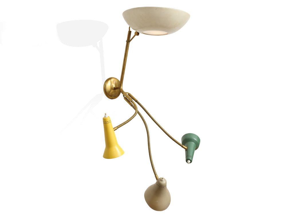 Italy | c. 1950 Lacquered aluminum, brass, frosted glass, plastic switches. 3 movable cone shades (one candelabra socket in each), and pivoting reflector shade with one standard E26 socket.