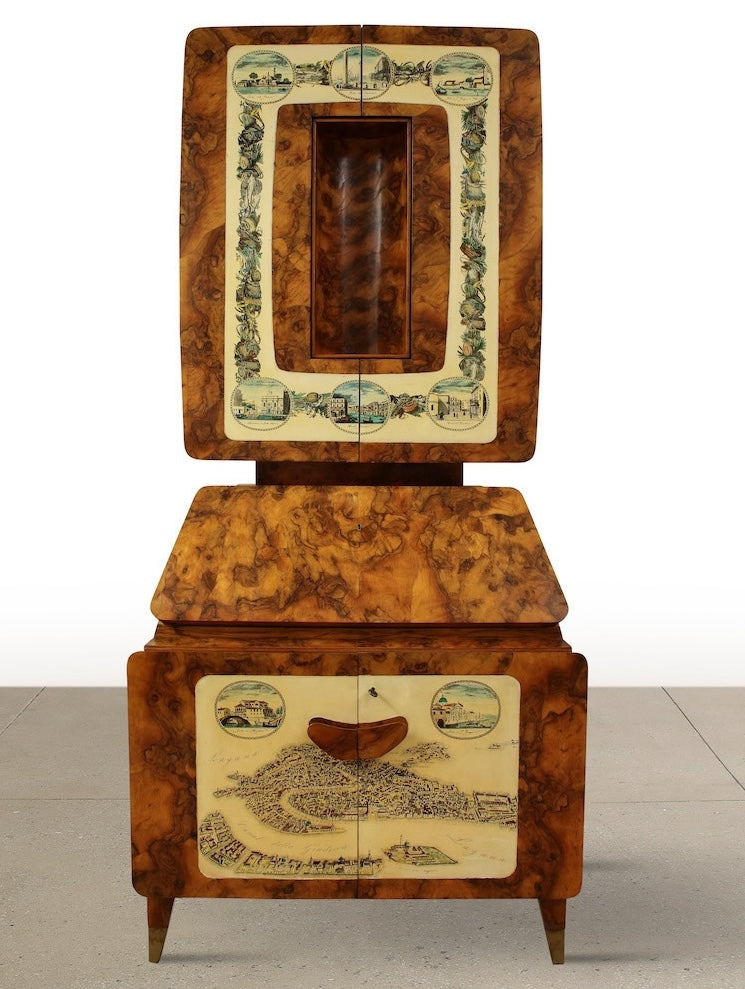 Italy | 1950 Ferrara walnut root, hand-painted & lithographic transfer-printed wood, brass, light. Produced by Giordano Chiesa. Top section with illuminated display areas, center drop-down desk, & lower storage compartment. Decorated by Piero Fornasetti, with maps & imagery of Venice. Original key included. Certificate of expertise issued by the Gio Ponti Archives.